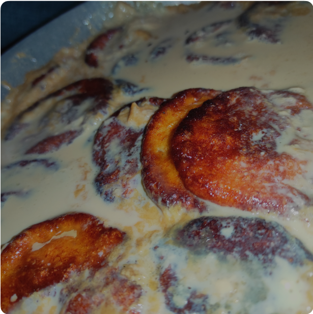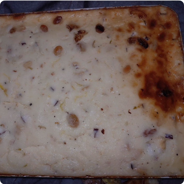 This dish is prepared by combining rice flour, jaggery, black gram, and coconut pitha, then baked until the crust is nicely browned.
